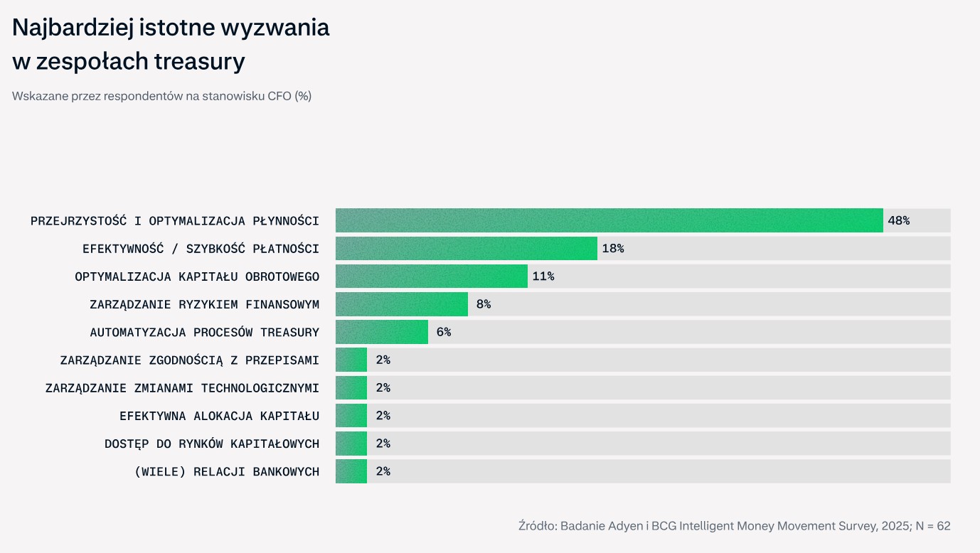 W przypadku firm o krótkich cyklach operacyjnych niedopasowanie pomiędzy momentem wpływów i wypływów środków staje się jednym z głównych źródeł ryzyka i ogranicza możliwość generowania zwrotu z kapitału obrotowego. Skala tego problemu jest istotna – 18 proc. CFO uznaje dziś szybkość realizacji płatności przychodzących i wychodzących jako jeden z kluczowych obszarów do usprawnienia.