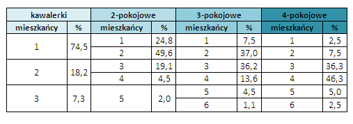Zgodnie z przewidywaniami zdecydowana większość klientów planujących kupno kawalerki to osoby, które zamierzają zamieszkać w nabywanym lokalu w pojedynkę. Jednak prawie co piąty klient poszukujący kawalerki zamierza zamieszkać w niej z drugą osobą (najczęściej partnerem/partnerką), a co trzynasty (7,3%) amator tak małego lokalu zamierza zamieszkać w nim we trójkę (najczęściej para z dzieckiem).