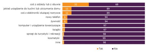 Badani zapytani o to, co w ostatnim roku kupili niepotrzebnie, najczęściej wskazywali na odzież i obuwie (32% odpowiedzi). Kolejne miejsca okupowały utensylia kuchenne i wyposażenie domowe oraz urządzenia elektroniczne. Najczęściej nieracjonalne wydatki były stosunkowo niewielkie – do 500 zł. Jednak 43% kupujących nie mogło sobie przypomnieć, ile wydało na zbędne przedmioty.
