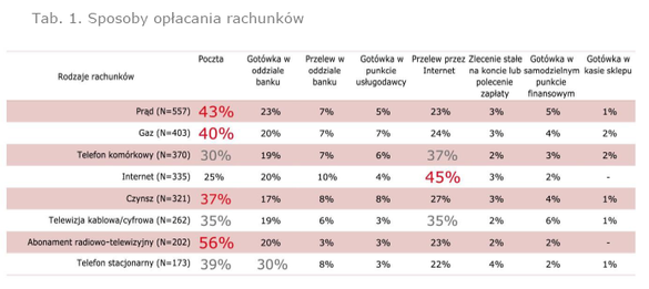 Transakcje bezgotówkowe nie są jednak standardem. Tylko niespełna 30 proc. osób opłaca rachunki drogą elektroniczną. W obiegu nadal króluje gotówka. Okazuje się, że rodzaj medium, za które dokonujemy płatności, wpływa na sposób, w jaki opłacamy rachunek. Drogą elektroniczną dokonywane są opłaty za usługi „nowoczesne”, tj. internet, telefonię komórkową, telewizję kablową i cyfrową. W placówkach pocztowych płacimy abonament radiowo-telewizyjny, prąd, gaz, czynsz i telefony stacjonarne.
