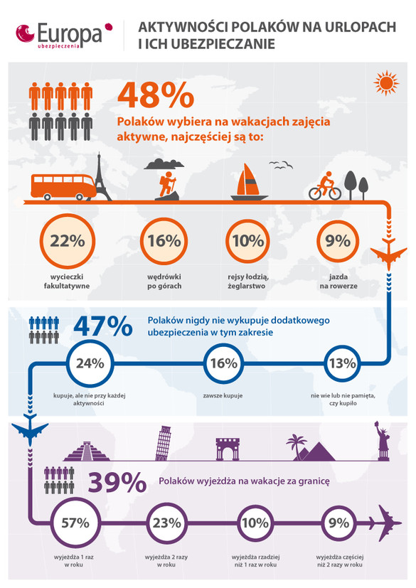 Jak wakacje to aktywnie – tak myśli 84 proc. Polaków, którzy wybierają się na urlop za granicę. W badaniu przeprowadzonym dla Towarzystwa Ubezpieczeń Europa jasno widać, że lubimy spędzać ten czas czynnie: niemal co druga osoba uprawiała sporty motorowodne, była w aquaparku, czy uczestniczyła w wycieczkach fakultatywnych. Niestety 49 proc. turystów nie wie, czy posiadane ubezpieczenie zabezpiecza ich w czasie tych aktywności. Dlaczego? Bo właśnie taki odsetek czyta pobieżnie lub wcale Ogólne Warunki Ubezpieczenia.