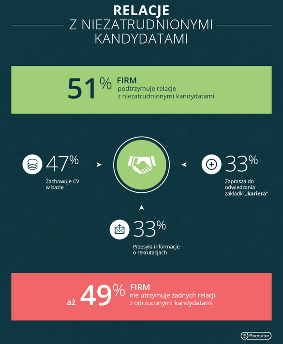 Połowa pracodawców deklaruje, że podtrzymuje relacje z kandydatami, którzy brali udział w procesie rekrutacyjnym, ale nie zostali zatrudnieni – wynika z 3. edycji badania „Candidate Experience” przeprowadzonego z inicjatywy eRecruiter i Koalicji na rzecz Przyjaznej Rekrutacji. Najczęściej firmy zachowują CV kandydatów w bazie (47%) oraz informują ich o kolejnych rekrutacjach (33%). Ponadto, co drugi rekruter podaje przyczyny niezatrudnienia osobom, które uczestniczyły w rozmowie kwalifikacyjnej. Niestety aż jedna trzecia rekruterów nie dba o ten obszar w ogóle.