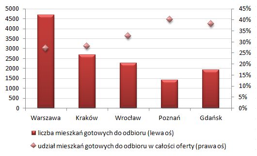 Poniżej zamieszczono wykres obrazujący udział mieszkań gotowych w całkowitej ofercie dostępnej na danym rynku. Jak widać różnice między poszczególnymi miastami są znaczące. Przykładowo w Poznaniu mimo iż bezwzględna liczba wybudowanych i niesprzedanych mieszkań jest najmniejsza, ich rynkowy udział jest najwyższy i wynosi 40%.