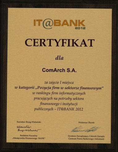 Comarch już piąty rok z rzędu zajmuje wysokie pozycje w rankingach IT@BANK 2012. W tym roku przedsiębiorstwo zajęło pierwsze miejsce w kategorii „Pozycja firm w sektorze finansowym”. Comarch SA został także wyróżniony Nagrodą Główną za zajęcie II miejsca w rankingu firm informatycznych pracujących na potrzeby sektora finansowego i instytucji publicznych.