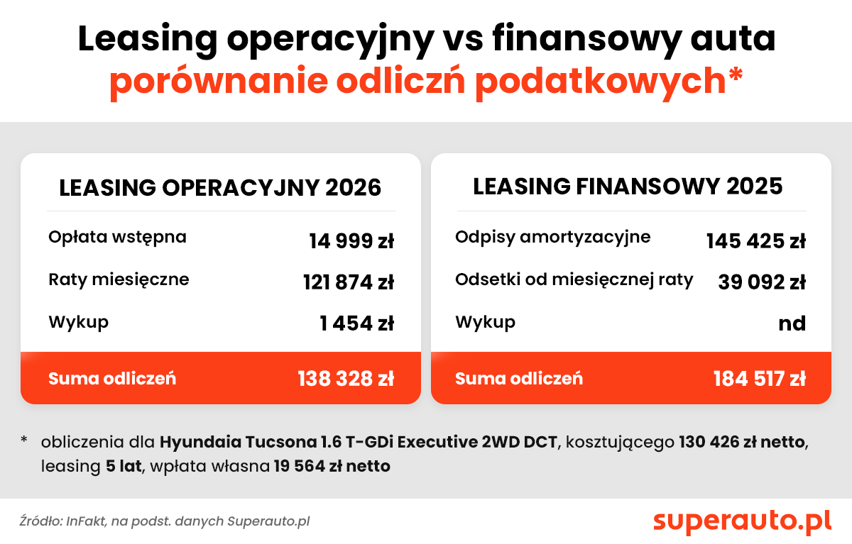 Porównując „leasing finansowy 2025” z „leasingiem operacyjnym 2026” w założonym harmonogramie spłat, można więc powiedzieć, że w przypadku tego pierwszego suma odliczeń będzie o niemal 46 tys. zł większa, co po uwzględnieniu 19-proc. podatku liniowego oraz składki zdrowotnej (4,9%) oznacza podatek niższy o 11 039 zł – tyle przez 5 lat zaoszczędzi nabywca Hyundaia Tucsona, jeśli kupi go jeszcze w tym roku i będzie amortyzował. Same koszty związane ze skorzystaniem z leasingu finansowego i operacyjnego są natomiast zbliżone. Przedstawia je tabela.