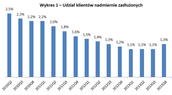 W całym 2013 r. udział kredytobiorców nadmiernie zadłużonych utrzymywał się poniżej 1,3 proc. W 4 kw. trend zaczął się odwracać, co może być spowodowane poprawianiem się ogólnego klimatu gospodarczego, skutkującego wzrostem zainteresowania kredytami, jak również przeniesieniem działalności powiązanych z bankami firm pożyczkowych z powrotem do banków.