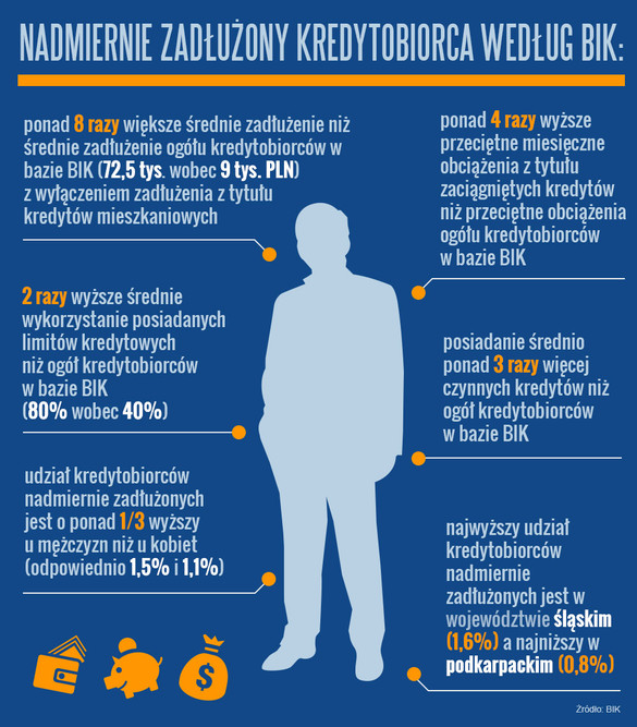 Chociaż liczbowo kredytobiorcy nadmiernie zadłużeni stanowią tylko 1,3 proc. klientów z czynnymi kredytami w bazie BIK, to jednak wartościowo udział takich kredytów wynosi 10,5 proc. (13,6 mld zł) całości zadłużenia ogółu kredytobiorców (z wyłączeniem zadłużenia z tytułu kredytów mieszkaniowych). Udział kredytów straconych tych kredytobiorców jest kilka razy wyższy niż kredytobiorców, którzy nie są nadmiernie zadłużeni.