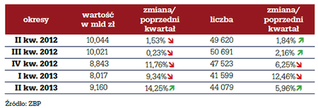 Autorzy raportu podkreślają, że tym razem sprawdził się stary wzór – zarówno wartość, jak i liczba nowo podpisanych umów, wzrosły w stosunku do I kwartału. W okresie od kwietnia do końca czerwca 2013 r. banki udzieliły 44 079 kredytów na kwotę 9,160 mld zł. Oznacza to zmianę odpowiednio o 5,96 proc. i 14,25 proc. w porównaniu do pierwszych trzech miesięcy tego roku. Tym samym odwrócił się trend spadkowy obserwowany od pięciu kwartałów.