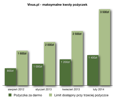 Pierwsza pożyczka za darmo to flagowa oferta Vivusa. Klient po miesiącu oddaje dokładnie tyle samo, ile pożyczył. W ciągu roku oferta pozwoliła internetowemu pożyczkodawcy zostać liderem branży. Po trzeciej podwyżce maksymalna kwota darmowej pożyczki wzrosła do 1400 zł. Wzrósł też maksymalny dostępny limit pożyczkowy i wynosi teraz 3500 zł. Obie kwoty są najwyższe wśród ofert dostępnych całkowicie online.