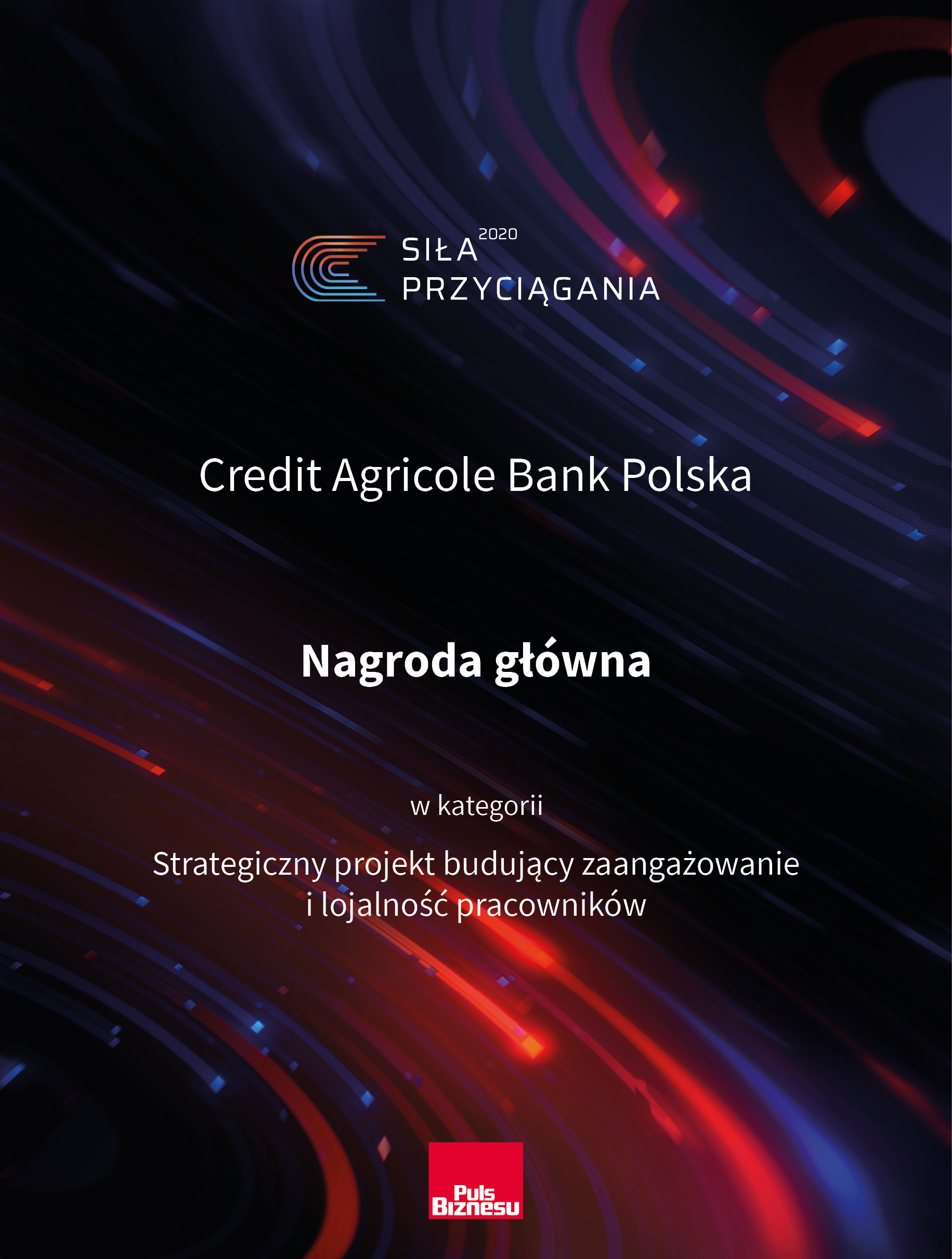 Działania Credit Agricole na rzecz tworzenia angażującego miejsca pracy zostały docenione w konkursie „Siła przyciągania” zorganizowanym przez Puls Biznesu. Bank zdobył nagrodę główną w kategorii „strategiczny projekt budujący zaangażowanie i lojalność pracowników”.