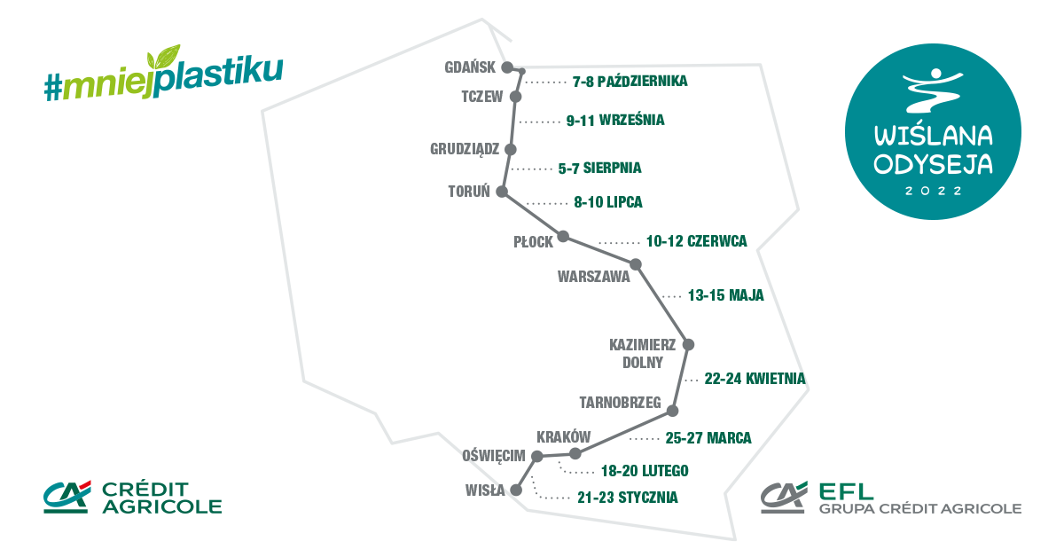 – Niektóre etapy będziemy pokonywać pieszo, inne na rowerach, część trasy przepłyniemy także na kajakach. A wszystko po to, by zwracać uwagę na problem zanieczyszczania rzek i mórz plastikowymi śmieciami. Chcemy w ten sposób uświadamiać Polaków, że każdy z nas przyczynia się do zaśmiecania środowiska, więc wszyscy też musimy zaangażować się w walkę z tym problemem – przekonuje Przemysław Przybylski z banku Credit Agricole.
