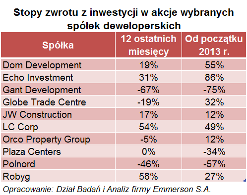 Mimo trudnej sytuacji w branży kilka spółek deweloperskich przynosi w tym roku znaczące zyski swoim akcjonariuszom. Z grona 10 spółek deweloperskich wybranych do analizy, najwyższe zyski od początku bieżącego roku przyniosły akcje Echo Investment (86%), Dom Development (55%), LC Corp (49%) oraz Robyg (42%). Na drugim końcu stawki znalazły się Gant Development (-75%), Polnord (-57%) oraz Plaza Centers (-34%).