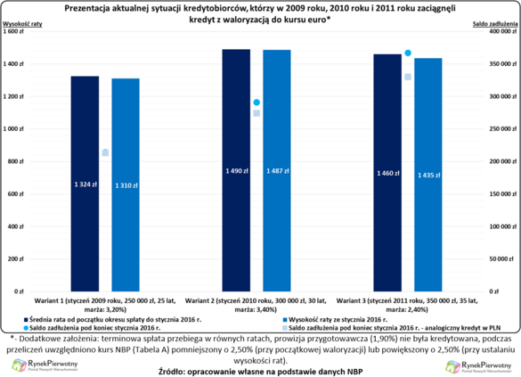 Trzeba również zwrócić uwagę, że przykładowy „eurowiec”, który zaciągnął kredyt w styczniu 2009 roku, obecnie ma prawie takie samo zadłużenie, jak osoba posiadająca analogiczny kredyt w złotym (marża: 2,70%). W przypadku „hipotek” z 2010 r. i 2011 r. różnica zadłużenia jest już znacznie większa (patrz poniższy wykres). To wynika z faktu, że w 2010 r. i 2011 r. kredyty były zaciągane przy niższym kursie euro.