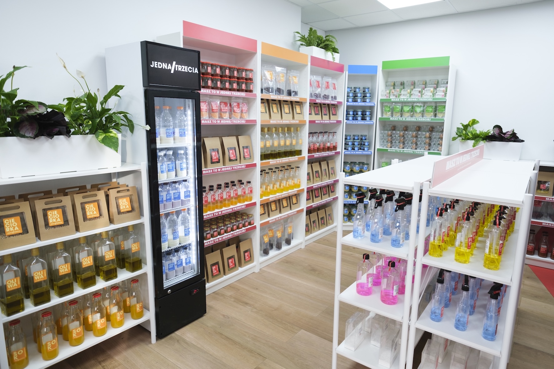 W drugim etapie, w połowie listopada, ruszyło serce kampanii – przestrzeń edukacyjna „Jedna/Trzecia”. Wnętrze imitowało prawdziwy sklep, ale zaprojektowany tak, by klienci odczuli drastyczną różnicę w sile nabywczej. Na półkach czekały atrapy produktów – grochu, oliwy czy proszku do prania – wypełnione tylko w 1/3 objętości. Etykiety zamiast składu prezentowały dane o konieczności oszczędzania. Odwiedzający otrzymywali też materiały edukacyjne i limitowane torby.