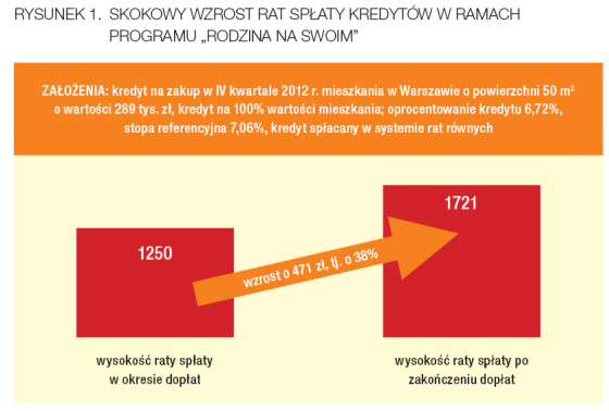 Nadzorca dostrzega też zagrożenie jakie generuje zakończony niedawno rządowy program „Rodzina na Swoim”. Po ośmiu latach dopłat gospodarstwa domowe będą musiały przejąć na siebie pełne koszty kredytów, co spowoduje skokowy wzrost wartości pojedynczej raty. Będzie to test, ilu kredytobiorców jest w stanie wygospodarować w swoim budżecie niezbędną dodatkową kwotę, a nie będzie to kwota mała. KNF jako przykład podał kredyt, którego rata przez pierwsze osiem lat wynosi około 1200 zł, a po zakończeniu dopłat wzrasta do około 1700 zł – wzrost o 38 proc.