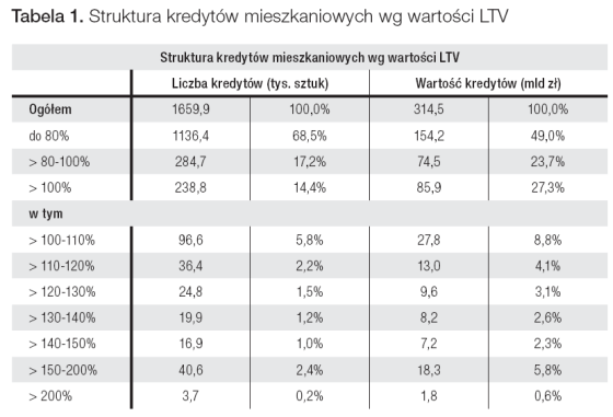 Już w tej chwili KNF wskazuje wysokie LTV znacznej części portfela kredytowego jako istotne zagrożenie. „Na koniec 2012 r. w portfelach banków było ponad 500 tys. kredytów o LTV > 80%, które stanowiły 51% wartości całego portfela, w tym 238,8 tys. kredytów o LTV > 100%, które stanowiły 27,3% wartości portfela, przy czym należy przypuszczać, że faktyczna liczba kredytów o wysokich LTV może być wyższa ze względu na niedoszacowanie przez banki obserwowanych w ostatnich latach obniżek cen nieruchomości. Wysokie LTV wzbudzają obawy o sytuację finansową banków w przypadku pogorszenia spłacalności tych kredytów (kwestia niskiej skali odzysku), jak też o sytuację gospodarstw domowych, które zostałyby objęte procesami windykacyjnymi (część z nich pomimo sprzedaży nieruchomości pozostałaby z bardzo wysokimi zobowiązaniami)”.
