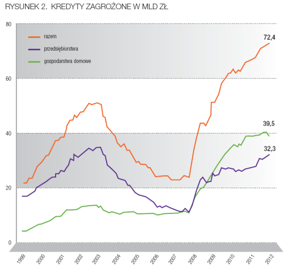 Jak wynika z raportu Komisji Nadzoru Finansowego (KNF), w 2012 r. nastąpił wzrost kredytów zagrożonych o 6,0 mld zł, tj. o 9 proc. i zwiększenie ich udziału w portfelu z 7,3 proc. do 7,7 proc. Najgorszą tendencję można obserwować wśród kredytów, które mogłyby mieć największy wpływ na zdynamizowanie wzrostu gospodarki – kredyty dla sektora przedsiębiorstw, kredyty dla drobnych przedsiębiorstw oraz kredyty mieszkaniowe. Jedyną grupą kredytów, których jakość poprawiła się w ubiegłym roku według KNF, są kredyty konsumpcyjne, ale Komisja zwraca jednocześnie uwagę, że poprawa może wynikać ze sprzedaży przez banki części zagrożonych kredytów.