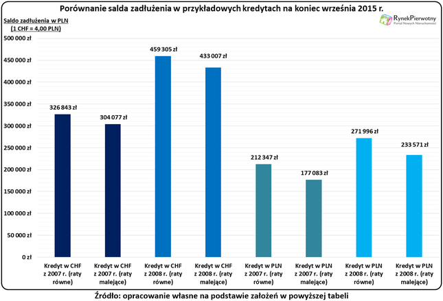 Podane wyniki obliczono w stosunku do „frankowego” kredytu z równymi ratami. Analogiczne różnice dla „hipotek” bez waloryzacji wynoszą 17,18% (2007 r.) oraz 18,93% (2008 r.).
