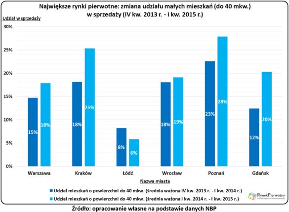 Poniższy wykres przedstawia średni udział małych lokali w sprzedaży deweloperów (wyniki za dwa okresy: IV kw. 2013 r. – I kw. 2014 r. oraz I kw. 2014 r. – I kw. 2015 r.). Po odpowiednim przekształceniu danych NBP można zauważyć, że odsetek małych mieszkań wzrósł na terenie pięciu metropolii (Warszawy, Krakowa, Wrocławia, Poznania i Gdańska). W dwóch ostatnich miastach zmiany były znaczące. Można je wiązać z dużą popularnością MdM-u. Co ciekawe, w Krakowie też odnotowano spory wzrost udziału małych lokali. Był on widoczny od II – III kw. 2014 r. To wskazuje, że wpływ na rynek miały zmiany w ofercie deweloperów (tzn. wprowadzenie dużej liczby małych i tanich „M” na peryferiach Krakowa).