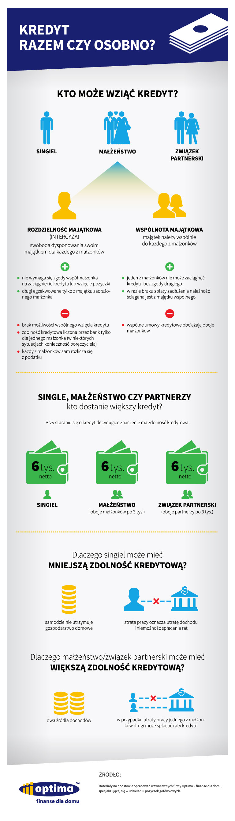 Kredyty bankowe dostępne są w praktyce dla każdego. Wystarczy mieć ukończone osiemnaście lat i wykazać się stałym źródłem dochodów oraz przejść pozytywnie ocenę kredytową przez bank. Tylko tyle i aż tyle. Czy stan cywilny naprawdę nie ma żadnego znaczenia?