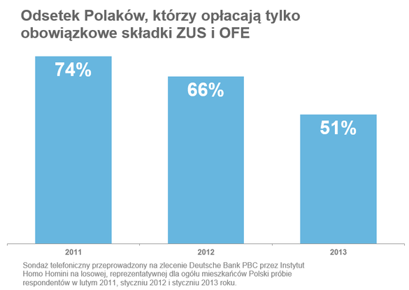 Zmiany w systemie emerytalnym, chociaż dotyczą odległej przyszłości, już teraz mają realny wpływ na zachowania Polaków. Coraz więcej osób decyduje się na dodatkowe, dobrowolne oszczędzanie na czas starości. Odsetek mieszkańców Polski, którzy ograniczają oszczędności emerytalne jedynie do opłacania obowiązkowych składek ZUS i OFE, spadła w ciągu dwóch lat z 74 do 51 proc., wynika z cyklicznego badań prowadzonych przez Deutsche Bank PBC. – Nadal ponad połowa Polaków pozostaje w tej kluczowej kwestii bierna, ale miejmy nadzieję, że kolejna reforma emerytalna skłoni następną grupę do samodzielnego oszczędzania – mówi Monika Szlosek. – Trzeba pamiętać, że oprócz I i II filaru, które są zależne od politycznych decyzji, jest też III całkowicie dobrowolny filar i to na nim powinniśmy się skoncentrować, myśląc o bezpiecznej finansowo jesieni życia. W zakresie III filaru wszystko zależy od nas samych, naszych decyzji i systematyczności – dodaje.