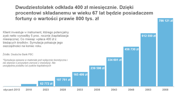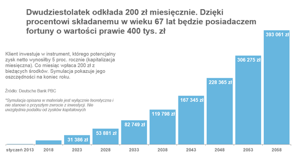 Jak duże? Eksperci Deutsche Bank przeprowadzili symulację programu oszczędnościowego, w którym młody, 22-letni klient inwestuje 200 złotych regularnie przez kolejne 45 lat, czyli do momentu, kiedy w wieku lat 67 prawdopodobnie przejdzie na emeryturę. Eksperci założyli, że długoterminowy instrument inwestycyjny osiąga średnią stopę zwrotu w wysokości 5 proc. rocznie. W niektórych okresach zarabia dużo więcej, w niektórych traci na wartości, jednak historyczne dane pokazują, że dywersyfikacja portfela inwestycyjnego oraz bardzo długi okres oszczędzania pozwalają na stabilne zyski na podobnym poziomie.