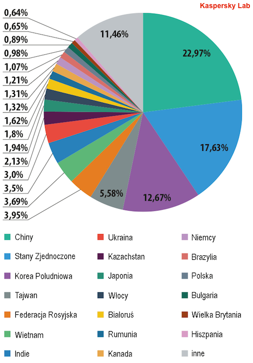 Największe źródła spamu stanowiły Chiny (23%) i Stany Zjednoczone (18%).