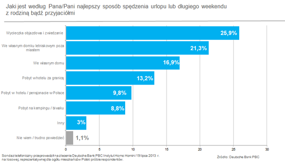 Na długi weekend, jak i na urlop, marzy nam się przede wszystkim wycieczka objazdowa ze zwiedzaniem, wolny czas na działce za miastem lub po prostu kilka spokojnych dni we własnym domu – wskazują wyniki sondażu Deutsche Bank PBC. Na półmetku wakacji bank zapytał Polaków, jaki jest według nich najlepszy sposób na spędzenie wolnego czasu z rodziną lub przyjaciółmi.