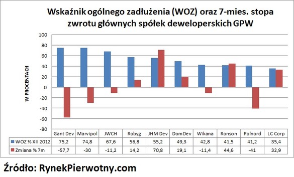 Popularnym, bardzo prostym i sprawdzonym sposobem pomiaru stopnia uzależnienia przedsiębiorstwa od kapitałów obcych jest wskaźnik ogólnego zadłużenia, liczony jako stosunek sumy zobowiązań do aktywów ogółem. Informuje on jaki procentowy udział w finansowaniu majątku firmy mają zobowiązania i dług. Przyjmuje się poziom do 50% jako bezpieczny, świadczący o dobrej kondycji finansowej przedsiębiorstwa, które jest w stanie w przeważającym stopniu samodzielnie finansować swoją działalność. Z kolei wysokie wartości wskaźnika, znacznie przekraczające 50%, są sygnałem ostrzegawczym, świadczącym o niebezpiecznym poziomie zadłużenia, które w przypadku znacznego pogorszenia koniunktury może skutkować problemami płynnościowymi, a w konsekwencji nawet upadłością firmy. Czy tego typu sytuacja jest udziałem dużej części spółek deweloperskich?