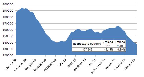 W samym lutym liczba rozpoczętych przez deweloperów lokali wyniosła niespełna 3200 – blisko o jedną trzecią mniej niż w lutym ubiegłego roku. Co ciekawe, w segmencie budownictwa indywidualnego luty 2013 z liczbą rozpoczętych inwestycji na poziomie 3100, okazał się nieznacznie – o 3,7 proc. – lepszy od lutego sprzed roku.