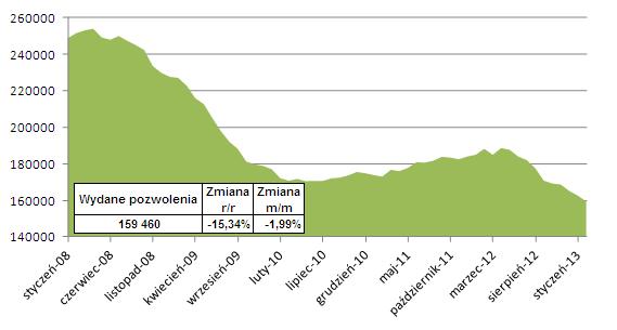 Zdecydowane osłabienie widać też w liczbie wydawanych pozwoleń na budowę mieszkań. W ciągu roku wydano ich łącznie niecałe 159,5 tys., czyli o 15,3 proc. mniej niż przed rokiem. To najmniej od co najmniej pięciu lat. W segmencie mieszkań przeznaczonych na sprzedaż, liczba lokali, na których budowę uzyskano pozwolenia, wyniosła blisko 68,2 tys., najmniej od lutego 2011 roku. Mniej pozwoleń otrzymali zarówno inwestorzy indywidualni, jak i deweloperzy, jednak pod względem ilościowym i procentowym zdecydowanie na minus przodują ci drudzy, bowiem w ciągu ostatniego roku wystarali się o 17,9 tys., czyli 20,8 proc. mniej w roku wcześniejszym.