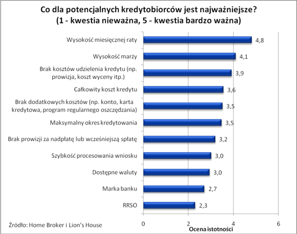 Wysokość raty, marży kredytowej i brak kosztów udzielenia kredytu – to trzy najważniejsze kwestie, na które w opinii doradców Home Broker i Lions House zwracają uwagę potencjalni kredytobiorcy. Każdy z pracowników zajmujących się obsługą finansową klientów w tych firmach mógł wskazać jak ważne dla przeciętnego kredytobiorcy (w skali od 1 do 5) są poszczególne elementy charakteryzujące ofertę kredytową.