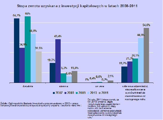 W ciągu ostatnich 15 lat całkowita stopa zwrotu z inwestycji w spółki WIG, uwzględniająca także przychody z wypłacanej dywidendy, wyniosła średnio 12 procent rocznie. To dużo więcej niż dały zarobić w tym okresie obligacje skarbowe czy lokaty. – Trzeba jednak pamiętać, że w przypadku rynku akcji odchylenie standardowe stopy zwrotu jest bardzo duże i wynosiło w tym okresie około 28 procent – mówi Łukasz Porębski, Wiceprezes Zarządu Stowarzyszenia Inwestorów Indywidualnych. -Oznacza to, że zyski są bardzo zmienne. To ryzyko, na które trzeba być gotowym lokując pieniądze na giełdzie – dodaje.