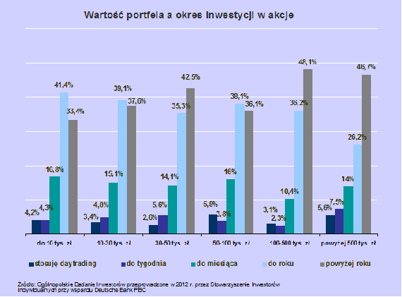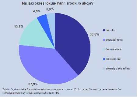 Niekoniecznie. Chociaż giełda zazwyczaj kojarzy się ze spekulacjami, w rzeczywistości zdecydowana większość z nas inwestuje długoterminowo. Jak pokazuje najnowsze Ogólnopolskie Badanie Inwestorów 2012 prowadzone przez Stowarzyszenie Inwestorów Indywidualnych (SII) we współpracy z Deutsche Bank PBC, aż trzy czwarte osób lokuje środki w akcje na okres powyżej miesiąca, a 38 proc. ankietowanych na ponad rok. Daytrading, czyli jedną z najbardziej spekulacyjnych strategii inwestycyjnych, w których kupuje się i sprzedaje akcje na bieżąco, stosuje zaledwie 4 proc. badanych przez SII osób.