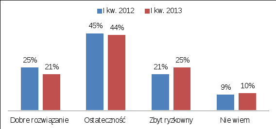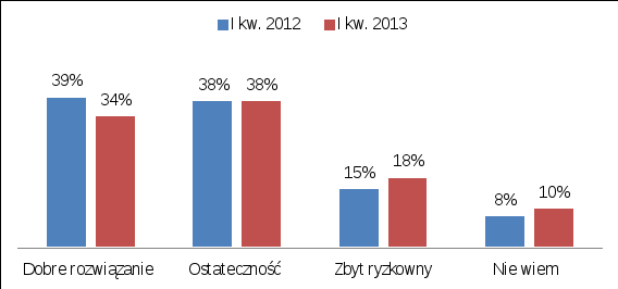 Co zaskakujące, kredytów przybywa, chociaż poparcie Polaków dla pożyczania spada. Jeszcze w I kw. zeszłego roku co czwarta osoba uważała, że kredyt gotówkowy to dobre rozwiązanie dla każdego, kto nie ma w danej chwili odpowiedniej gotówki lub nie chce jednorazowo wydawać zbyt dużej kwoty, w tym roku takiej odpowiedzi udziela 21 proc. badanych (Audyt Bankowości Detalicznej TNS Polska, I kw. 2013 r. Próba ogólnopolska reprezentatywna N=3000).
