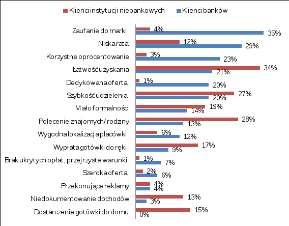 Zupełnie innymi przesłankami niż klienci banków kierują się przy wyborze kredytodawcy osoby związane z instytucjami niebankowymi. Największe znaczenie ma łatwość (34 proc.) i szybkość (27 proc.) pożyczenia pieniędzy. Choć i tu na liście argumentów występuje element natury emocjonalnej – polecenia znajomych lub rodziny. Rekomendacje te mają całkiem wysoką, trzecią pozycję i zyskały aż 25 proc. wskazań. Na dalszych miejscach znalazły się: brak formalności (19 proc.) oraz wypłata gotówki do ręki (17 proc.), brak konieczności dokumentowania dochodów (13 proc.) i dopiero siódma jest wysokość raty (12 proc.).