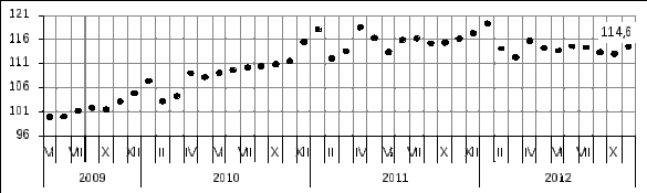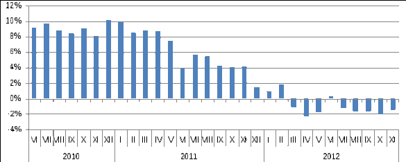 Spadek w ujęciu rocznym stał się już normą. Z 11 odczytów wskaźnika w 2012 r. wzrost w skali roku odnotowaliśmy tylko trzykrotnie, w pozostałych ośmiu miesiącach obserwowaliśmy spadki. Ostatni wzrost rok do roku miał miejsce w czerwcu.