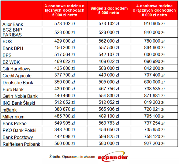 Atrakcyjność oferty kredytu hipotecznego zależy nie tylko od jego kosztu, ale również dostępności. Expander zwraca uwagę, że część banków wymaga nie 10%, lecz aż 20% wkładu własnego. Poza tym w poszczególnych bankach bardzo różnie liczona jest maksymalna dostępna kwota kredytu. Dla przykładu rodzina z dochodem 5 000 zł netto w Alior Banku dostanie nawet 573 000 zł, a w PKO BP tylko 348 000 zł.