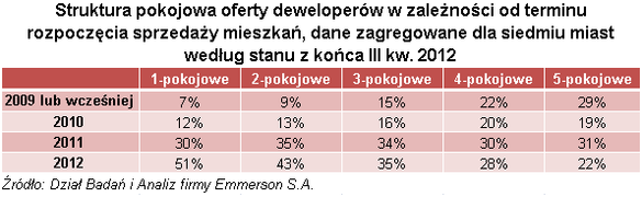 Nie zmienia to faktu, że pomimo stosowania różnorakich chwytów promocyjnych takie mieszkania nadal często są przysłowiową kulą u nogi deweloperów, którzy nie mogą odzyskać zainwestowanego w nie kapitału. Analiza struktury bieżącej oferty mieszkaniowej deweloperów na siedmiu największych rynkach lokalnych wykazała bezpośredni związek między wielkością mieszkań a czasem ich sprzedaży. Przykładowo w strukturze oferowanych kawalerek ponad połowę stanowią te wystawione na sprzedaż w bieżącym roku. Zaledwie 7% mieszkań jednopokojowych pozostaje w sprzedaży od co najmniej trzech lat. W przypadku mieszkań pięciopokojowych widoczna jest odwrotna relacja. Tegoroczne lokale odpowiadają za 22% łącznej podaży lokali o tej charakterystyce, podczas gdy aż 29% przypada na apartamenty wprowadzone do oferty w 2009 r. lub wcześniej.