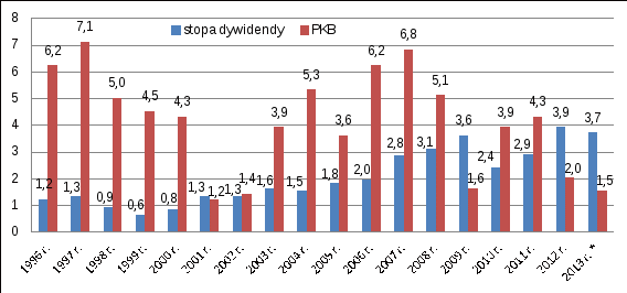W ciągu kilkunastu poprzednich lat, wspomniana prawidłowość była bardzo dobrze widoczna. Stopa dywidendy dla ogółu spółek, notowanych na warszawskim parkiecie, zmniejszała się w okresach, gdy gospodarka słabła, rosła zaś w czasie lepszej koniunktury. Schemat ten nie uległ zakłóceniu nawet w kryzysowych i pokryzysowych latach 2008-2011. Sytuacja uległa radykalnej zmianie w 2012 r. Tempo wzrostu gospodarczego zmniejszyło się z 3,9 do 2 proc., a więc niemal o połowę, zaś stopa dywidendy wzrosła z 2,9 do 3,9 proc. (trzeba jednak pamiętać, że stopę dywidendy za dany rok liczy się biorąc za podstawę zyski wypłacone w tym roku, jednak wypracowane rok wcześniej). Warto też zauważyć, że w ciągu ostatnich 17 lat jedynie dwukrotnie (w latach 2001 i 2002 ) mieliśmy do czynienia z sytuacją, gdy stopa dywidendy dla giełdowych firm była zbliżona do tempa wzrostu PKB, a tylko raz, w nietypowym 2009 r., przewyższała dynamikę wzrostu gospodarczego. Nawet w latach gospodarczego boomu stopa dywidendy była o ponad połowę niższa niż tempo wzrostu PKB. Jeśli uznamy, że wcześniej polityka dywidendowa spółek była zbyt „oszczędna”, to sytuację, w której stopa dywidendy jest dwukrotnie wyższa niż dynamika PKB, trudno uznać za racjonalnie uzasadnioną.
