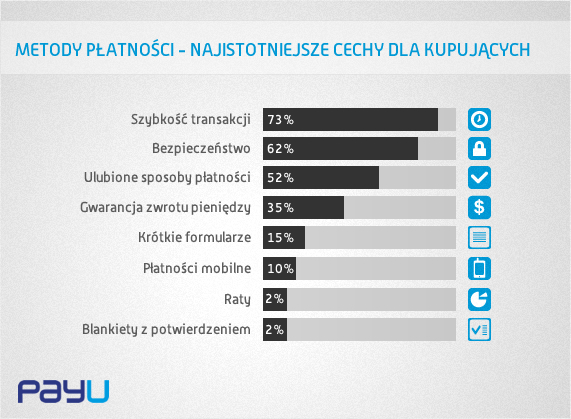 Kupujący nieustannie poszukują coraz wygodniejszych sposobów dokonywania płatności za zakupy w sieci, ale wraz z nowymi rozwiązaniami mogą rosnąć ich obawy o bezpieczeństwo. Z badania przeprowadzonego przez PayU wynika, że kupujący najczęściej obawiają się nieotrzymania towaru od nieuczciwego sprzedawcy lub dostarczenia uszkodzonego produktu. Inną ważną kwestią, na którą zwracają uwagę, jest ochrona danych osobowych. W tej sytuacji kluczowe znaczenie ma znowu wybór właściwego dostawcy płatności internetowych, czyli takiego, który wypełnia odpowiednie standardy bezpieczeństwa.