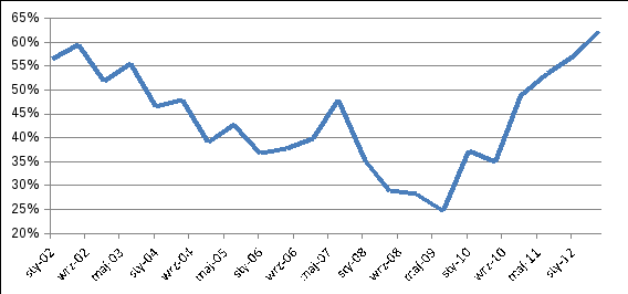 Wprowadzony z początkiem 2012 roku zakaz akwizycji jak najbardziej potwierdził tę tezę. Otóż w całym ubiegłym roku na zmianę fundusz zdecydowało się już tylko niespełna 120 tys. osób, czyli prawie 80 proc. mniej niż w roku 2011. Co więcej, z sesji na sesję ich liczba skokowo malał. Jeszcze w lutym 2012 roku była wysoka, zbliżona do tej z lat ubiegłych i wyniosła 103,4 tys. Za to w trzech kolejnych było to odpowiednio: 12,5 tys., 2,1 tys. i 1,5 tys. Jeśli więc założyć, że w przyszłości liczba osób zmieniających fundusz będzie się kształtowała w okolicach 2000 na sesję transferową, to rocznie ich suma nie powinna przekraczać 10 tys. A to oznacza, że współczynnik transferów spadnie z dotychczasowych 3-4 proc. do 0,05 proc.