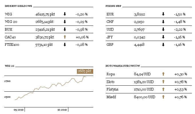 Rynek wrócił więc do prawideł, w których najczęściej funkcjonuje. Dane o nastrojach Amerykanów, ich wydatkach i dochodach, a także o spadającej liczbie wniosków o zasiłki dla bezrobotnych wprawiły inwestorów w dobre nastroje. Sesje w USA zakończyły się mocnymi wzrostami, a dziś rano dzięki akcjom eksporterów Nikkei zyskał 0,5 proc. Kospi zyskał 0,1 proc. (czy w czwartek rano inwestorzy pamiętają jeszcze, że dwa dni temu Korea Południowa została ostrzelana przez Północną?), a Szanghai Composite o 1,3 proc.