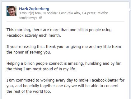 „Dziś rano okazało się, że mamy ponad miliard aktywnych użytkowników Facebooka miesięcznie. Jeśli to czytasz: dziękuję ci i czuję się zaszczycony, że ja i mój mały zespół możemy ci służyć. Pomaganie miliardowi osób w utrzymywaniu kontaktów jest niesamowite, to zdecydowanie mój największy powód do dumy. Czuję się zobowiązany pracować nad Facebookiem każdego dnia, by ulepszać go dla was. Mam nadzieję, że pewnego dnia uda nam się razem połączyć także z resztą świata” – napisał Mark Zuckerberg.