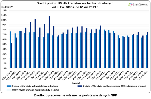 W kwietniu praktycznie wszystkie raty „frankowych” kredytów powinny wrócić do poziomu z końca 2014 r. (m.in. dzięki bardzo niskim notowaniom LIBOR-u). Znacznie większym problemem niż wysokość rat, jest aktualny poziom zadłużenia osób, które podpisały umowę kredytową w 2007 r. lub 2008 r. (patrz poniższy wykres). Poważny problem z „frankowym” długiem ma około 180 000 gospodarstw domowych. Ich aktualne zobowiązanie po przeliczeniu na złote przekracza 100% wartości mieszkania (wskaźnik LtV większy niż 100%). Ewentualna pomoc powinna się skupić na osobach z tej grupy, które dodatkowo osiągają dość niskie dochody (np. nie wyższe niż krajowa średnia + 10%)