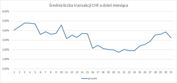 Currency One, największa internetowa spółka wymiany walut w Polsce, właściciel Internetowykantor.pl i Walutomatu, przeanalizowała zakupy CHF dokonywane przez swoich klientów. Wynika z nich, że najbardziej popularnym terminem zakupu franków jest zdecydowanie początek miesiąca, najczęściej między 3 a 5. To częsty termin spłaty rat kredytów, ustawiany przez klientów w bankach. To także moment wejścia pensji na konto, stąd wzrost zakupów w tym okresie. Podobny trend, ale w nieco mniejszej skali widać 10 dnia miesiąca. Z tych samych względów – pracodawca musi wypłacić pensję pracownikowi właśnie do 10 dnia następnego miesiąca.