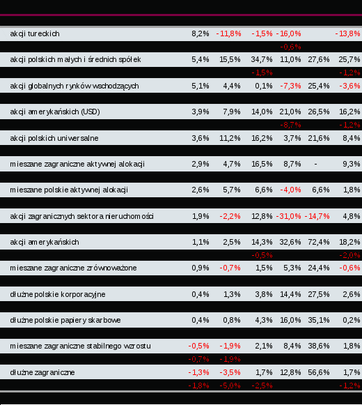 Najlepszą inwestycją we wrześniu były fundusze akcji tureckich, które zyskały średnio ponad +8%. Jednak licząc od początku roku wciąż są na minusie (-13,8%). W czołówce pod względem stóp zwrotu znalazły się również rozwiązania inwestujące na europejskich rynkach wschodzących (+5,5%), a także fundusze akcji rosyjskich (+5,1%). Duży wpływ na wyniki funduszy zagranicznych denominowanych w PLN miało umocnienie się złotego względem dolara (o +3,0%) i euro (o +1,2%) we wrześniu. Jednostki w PLN wypracowały przez to słabsze wyniki. Przykładowo fundusze akcji amerykańskich w USD zyskały blisko +4,0%, a w PLN jedynie +1,1%. Z podobną sytuacją mieliśmy do czynienia również w innych grupach. Różnice walutowe były główną przyczyną strat złotowych jednostek funduszy dłużnych zagranicznych inwestujących w USA oraz w Europie, które w walucie bazowej zyskały odpowiednio +0,9% oraz +0,4%.