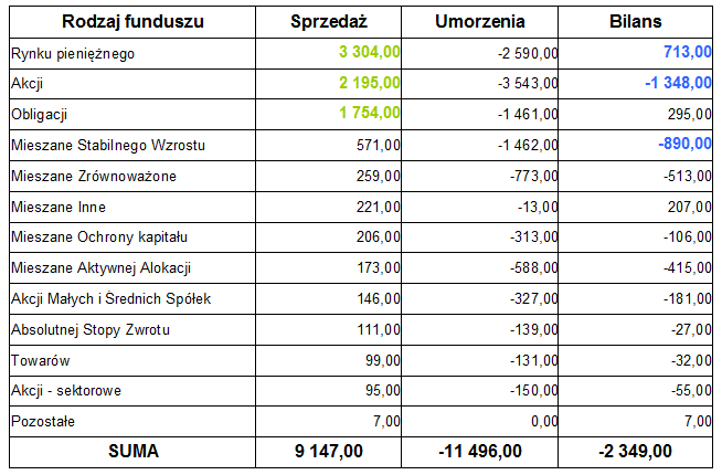 Towarzystwa Funduszy Inwestycyjnych (TFI) sprzedały najwięcej funduszy, których polityka inwestycyjna opiera się na instrumentach rynku pieniężnego. Sprzedano jednostki o łącznej wartości 3,3 mld złotych i w tym przypadku wystąpiła nadwyżka między sprzedażą, a umorzeniami w wysokości 713 milionów złotych.