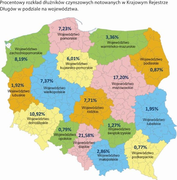 Tradycyjnie najwięcej dłużników czynszowych znajdziemy na Śląsku i Mazowszu. W porównaniu z ubiegłym rokiem sytuacja zmieniła się o tyle, że Górnoślązacy zamienili się z Mazowszanami miejscem na najwyższym podium i stanowią oni aż 21% wszystkich dłużników mieszkaniowych, co jest wzrostem o ponad pięć punktów procentowych w porównaniu do poprzedniego raportu.