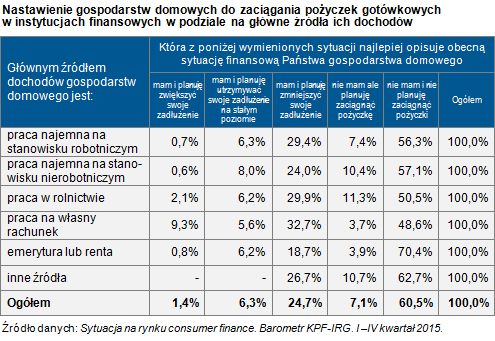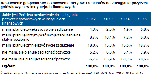 W kontekście konserwatywnych postaw wobec zaciągania zobowiązań w postaci gotówkowego kredytu konsumenckiego na podkreślenie zasługuje fakt, iż gospodarstwa domowe emerytów i rencistów wykazują się jeszcze większym konserwatyzmem niż ogół polskich gospodarstw domowych. Ponad 70% gospodarstw utrzymujących się z emerytury i renty nie planuje zaciągać pożyczek gotówkowych i prawie 19% z nich chce zmniejszyć zobowiązania tego typu. Łącznie tylko niespełna 5% zamierza zaciągnąć nowe zobowiązanie lub zwiększyć już istniejące i udział ten jest w 2015 roku niższy o 1,5 pp. w stosunku do roku 2012.